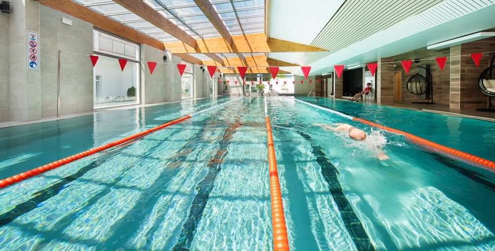 - Pełnowymiarowy kryty basen pływacki /długość 25 m, cztery tory/,