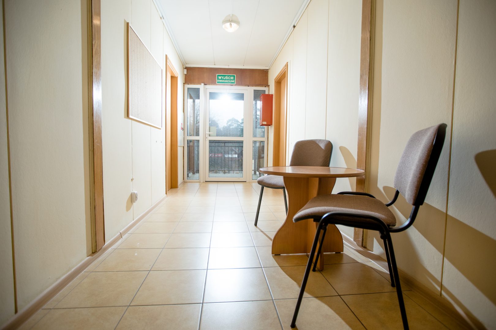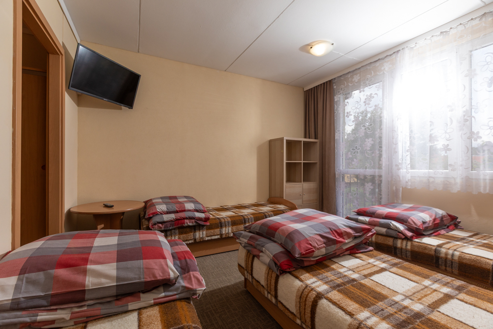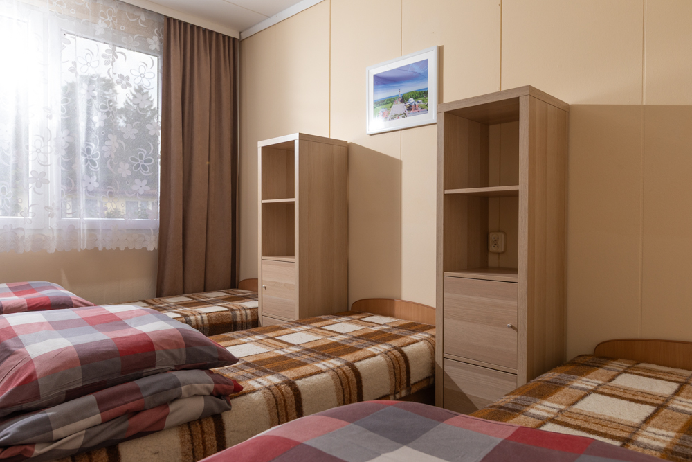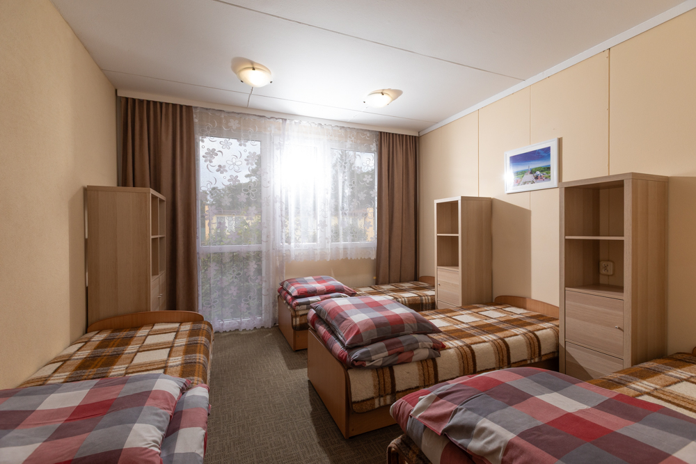 Wyposażenie standardowego pokoju to cztery jednoosobowe tapczany, cztery wysokie regały systemu IKEA KALLAX /jeden podwójny i dwa pojedyncze/, stolik. W korytarzyku - przedsionku znajduje się duża zabudowana szafa. Każdy pokój wyposażony jest w płaski telewizor LCD z ekranem 32".W obu budynkach na każdej kondygnacji znajdują się cztery duże pokoje, znacząco większe od standardowych. W razie potrzeby w takim pokoju /po wstawieniu dodatkowego tapczanu/ może mieszkać pięć osób.. Pozostałe wyposażenie jest analogiczne z pokojem standardowym.