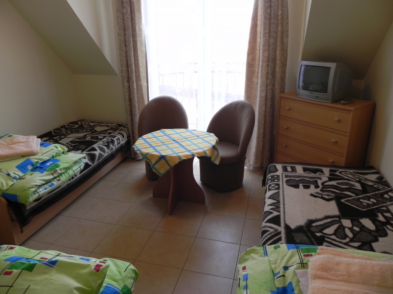 Każdy pokój jest wyposażony w trzy jednoosobowe tapczaniki lub dwuosobową kanapę i tapczanik, 32" telewizor LCD, lodówkę, szafę, szafki nocne, stolik, krzesełka. Dodatkowo - czajnik bezprzewodowy, szklanki, talerzyki, sztućce, sprzęt plażowy. Łazienka z kabiną natryskową.